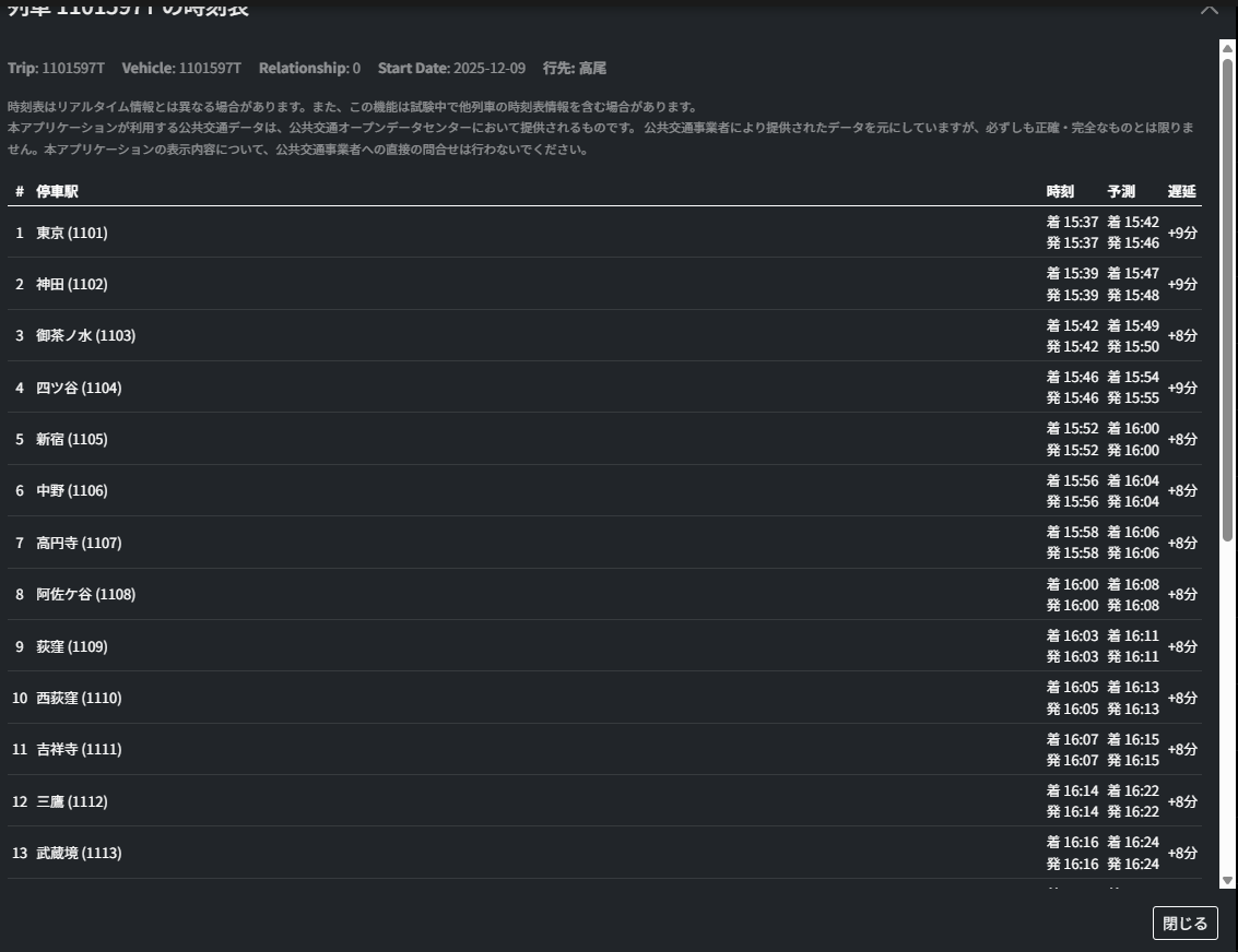 - まだまだバグが多く、開けない列車もあるのですが、ポップアップで時刻表を表示するようにいたしました。