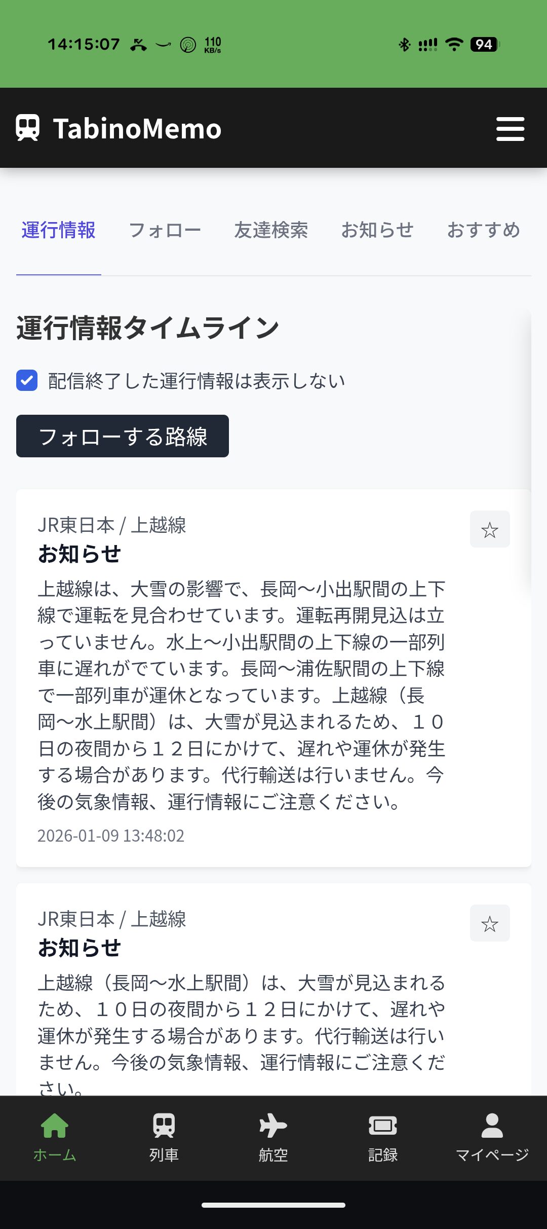 - 運行情報タイムライン(一部ログインなしでも利用可能)